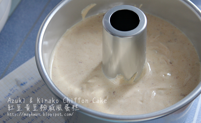 最近城中一間和菓子甜品店大熱,我沒有去湊熱鬧,卻用了和菓子常用的食材──紅豆及黃豆粉來做戚風蛋糕。繼合桃後,紅豆又是媽媽喜歡的食材,每次都嫌我下的紅豆不夠多!